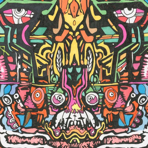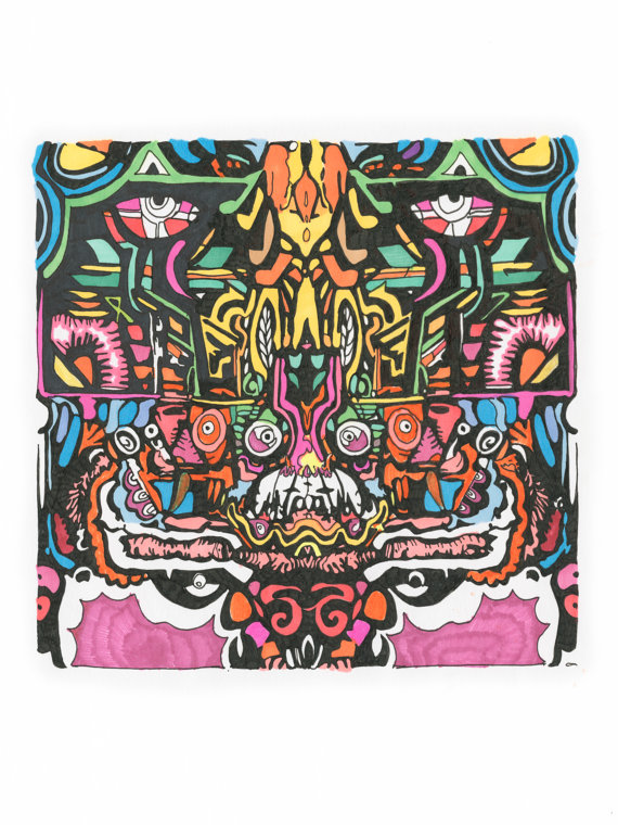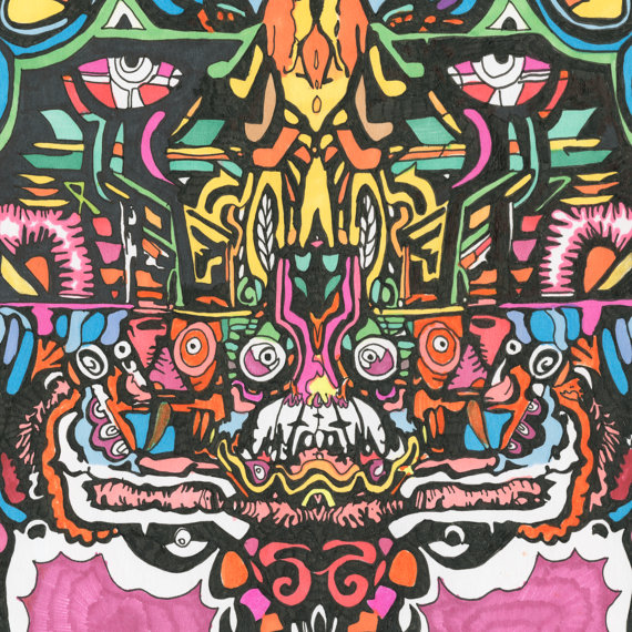 “Psychedelic Eyes” is a bold representation of Nate Longcope’s most popular pattern language that is brimming with vivid color and fine detail. This intense mirrored design holds a strong presence on a wall.